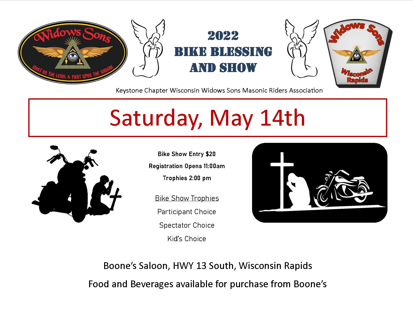 Wisconsin Rapids Keystone chapter of Widows Sons put on a motorcycle show with awards for Spectators choice, Kids choice, Participants choice and the Presidents choice awards. In addition to the awards, Jason conducted a bike-blessing event for the start of spring riding season. The message offered blessings of guidance and protection for all riders with a reminder to ride with safety in mind. A heartfelt thank you to Jason for conducting the bike blessing with dedication. Thank you to all who attended or particpated in the event.