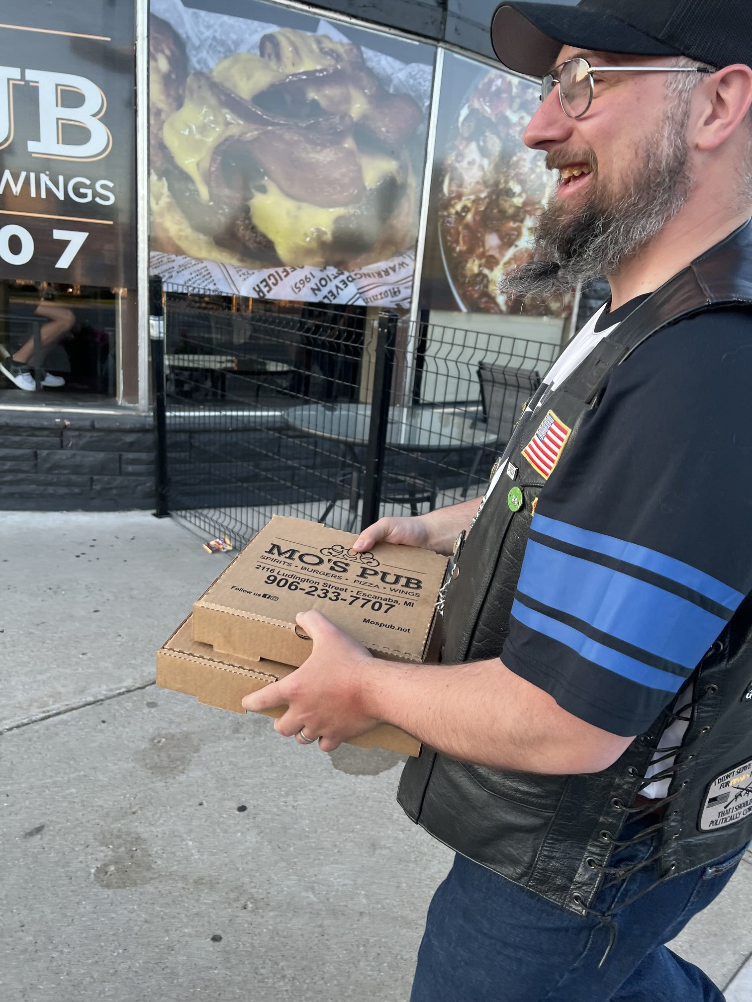 Bro. Archimedes picked up another job..Pizza delivery!Strapping down the goods